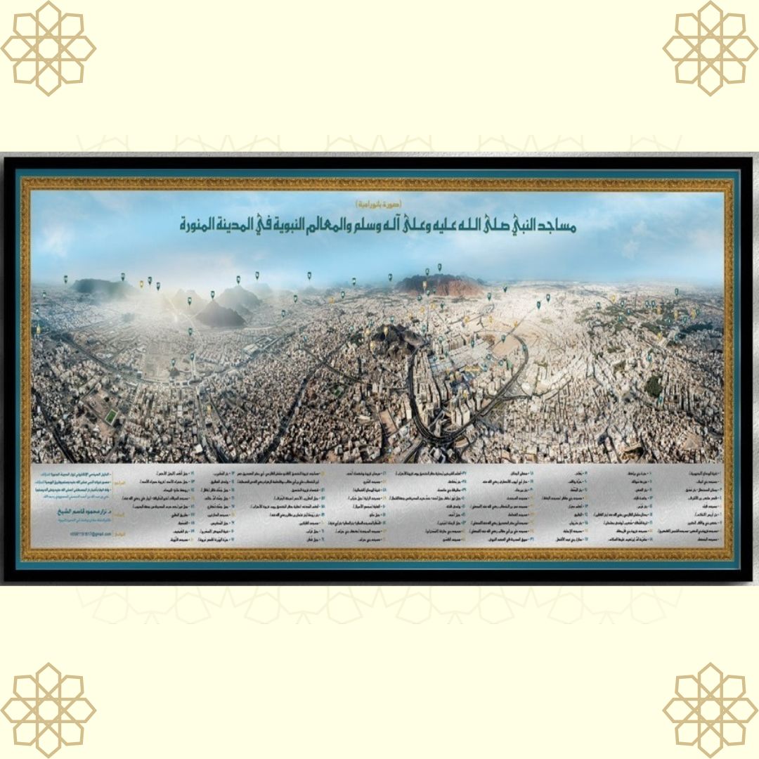 لوحة جميلة فيها صورة جوية للمدينة المنورة(360درجة) موضح فيها مكان (80) معلم من المساجد والمعالم النبوية في المدينة المنورة مثل الآبار والجبال والأماكن التي لها تعلق بسيرة النبي صلى الله عليه وسلم المقاس يبدأ من 120*70 سم